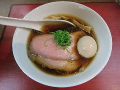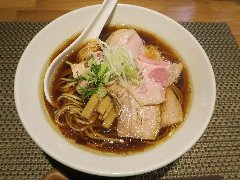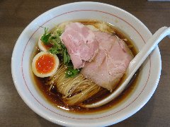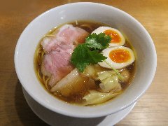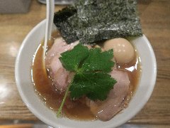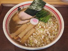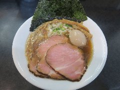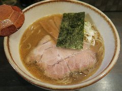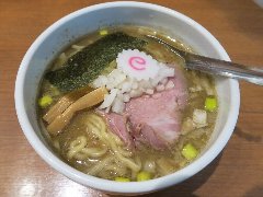 | つくばエキスプレスの浅草駅から2、3分、河童橋方面の狭い路地にあります。白い暖簾が目印です。引き戸の半分は室外機に覆われています。開店前に4人の待ち客がいました。店内は、カウンター席が7つで狭いです。和の雰囲気です。厨房には渋いご主人、先に女将さんが注文を取り会計します。醤油(750円)+味玉(100円)を注文しました。自家製の麺は細麺と中太手もみ麺から選択、細麺にしました。チャーシュー(豚ロースと豚バラ)、メンマ、蓮根、味玉、白髪ネギ、刻みネギが入っていました。麺はそれほど細くはなく、普通の太さでやや縮れていました。スープは無化調、鶏と魚介出汁できれいな色です。とても美味しかったです。蓮根も食感がいいです。中太麺も食べてみたいですね。他には、塩、生姜そば、おそしそば、自家製ソースのかつ丼などがありました。 |