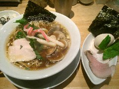なな蓮 | ラーメン | 東京都中央区日本橋室町 | ★★ (2015.1.30) | 普通 | ![]() | 三越前駅から1分、日本橋の近くにあります。ななはすと読みます。ビルの1階ですが何となく和風な外観です。店内は、カウンター席が8つ、テーブル席が3つありました。ちょっと暗め、ジャズが流れ、お洒落な雰囲気です。支那そば(800円)を注文しました。海苔、チャーシュー(2種類、バラと肩ロース)、ほうれん草、めんま、かいわれ、長ネギが入っていました。麺は平打ちのストレートです。スープは、比内地鶏と魚介と秋田の醤油から作られます。きれいな色で透き通っています。無化調だそうです。すっきりとしたスープが美味しいです。店員さんは丁寧でした。 |