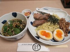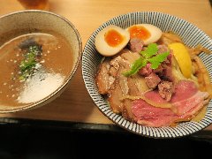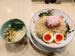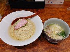 ![]() | 小川町駅や淡路町駅から1、2分、靖国通りから路地を南に進むとあります。ビルの1階です。木の扉の外観です。開店前に行列が出来ましたが1巡目で入れました。店内は、カウンター席が7つ、狭いです。明るくてきれい、音楽が大きめで掛かっていました。特製鰹昆布水つけめん(1600円)を注文しました。麺の上にレアチャーシュー、味玉、麺は昆布水に浸かっていました。つけ汁にワンタン、青菜が入っていました。麺はやや太めのストレート、そのまま食べると小麦の旨味を感じます。つけ汁は魚介出汁、すっきりした味わいです。ワンタンは肉と海老、ぷりぷりでした。美味しかったです。でも高いなあ。他には、つけ担々、白だしワンタン麺、山椒ラーメンなどがありました。 |