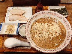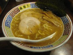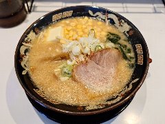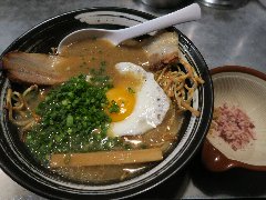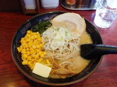 ![]() | 上野広小路駅から1、2分、上野中通り商店街から路地に入るとあります。3階建ての建物の1階です。黒壁の外観です。店内は、カウンター席が14ありました。カウンターの上に赤い暖簾がかかっていました。店員さんは元気です。味噌バターコーンラーメン(1090円)を注文しました。もやし、わかめ、チャーシュー、めんま、刻みネギが入っていました、麺は中太で縮れていました。スープは豚骨ベースで白味噌と野菜の旨味が合わさってマイルド、さらにバターでコクが出ます。美味しかったです。他には、札幌味噌ラーメン、旭川醤油ラーメン、味噌オロチョン、鉄火麺などがありました。 |