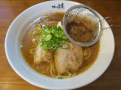 神保町 可以 | ラーメン | 東京都千代田区神田神保町 | ★★ (2016.12.20) | 普通 | ![]() | 神保町駅から1分、神保町の交差店の近くの路地にあります。ビルの1階です。燕三条系ラーメンのお店です。店内は、カウンター席が12ありました。きれいなお店です。味玉チャーシュー背脂煮干しラーメン(1050円)を注文しました。味玉、チャーシュー、メンマ、刻み玉ねぎが入っていました。麺は、太い平打ちで縮れていました。スープは、煮干出汁に醤油ダレ、大量の背脂が浮いています。かなり濃い味こってりスープと背脂の甘みと刻み玉ねぎとよく合います。美味しいです。他には、一色つけめん、二色つけめん、生姜醤油ラーメンなどがありました。 |
