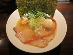 ![]() | 人形町駅から1分ほど、人形町の交差点の少し北側にあります。3階建ての建物の白壁に大きな看板が目立っています。ガラス戸の外観です。店内は、カウンター席が10ありました。きれいで明るいです。三味線の曲が流れていました。らーめん(中)(900円)を注文しました。海苔、ナルト、チャーシュー、メンマ、小松菜、刻みネギが入っていました。見た目がいいです。麺は太めのストレートです。スープは、地鶏、軍鶏、豚のげんこつ、煮干しなどの出汁、茶色に濁っています。先に煮干し、後から動物系の旨味がきます。旨味が濃くしっかりしていました。美味しかったです。他には、らーめんのサイズは大、中、小、つけめんなどがありました。トッピングの小鬼はエビ辛子です。 |