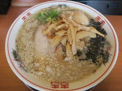 RAMEN GOSSOU | ラーメン | 東京都新宿区早稲田鶴巻町 | ★★ (2016.12.17) | 普通 | ![]() | 早稲田駅から5分ほど、早大通り沿いにあります。ラーメン屋には見えない洒落た外観です。店内は、カウンター席が7つ、狭いです。新しくきれいで明るいです。特製ラーメン(980円)を注文しました。海苔(5枚)、チャーシュー、メンマ、水菜、刻みネギ、柚子、別皿で、味玉、チャーシュー(2枚)が出されます。チャーシューは低温調理、1枚が大きくてブラックペッパーがかかっていました。美味しいチャーシューです。麺はやや太めで縮れていました。スープは、動物系と魚介系を合わせてコクがあって濃厚、美味しいです。他には、ホタテの塩らーめん、つけめんなどがありました。 |