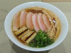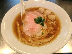 ![]() | 神保町駅から1分ほど、靖国通りの一本南側の路地にあります。いつも行列が出来ています。白壁で白い暖簾と提灯が掛かっていました。店内は、カウンター席が8つありました。小ぢんまりしています。和の雰囲気、店内にも待ち席があります。厨房は店の奥にあります。特選醤油蕎麦(1150円)を注文しました。チャーシュー(大きなレア2枚と鶏2枚)、味玉、穂先メンマ、刻みねぎなどが入っていました。麺はやや細めのストレートです。スープはきれいな色で、鶏の旨味と醤油の香りと甘さがありました。バランスがいいスープです。美味しかったです。チャーシューも美味しいです。でもちょっと高い気がします。他には、塩蕎麦、煮干蕎麦などがありました。 |