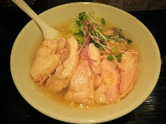 鶏そば | ラーメン | 東京都新宿区高田馬場 | ★★★ (2013.3.10) | 普通 | ![]() | 高田馬場駅、早稲田口から3分ほどのところにあります。店内は落ち着いた雰囲気です。カウンター席が15ほどあります。鶏そば(680円)+味玉(100円)を食べました。先ず柚子胡椒が入った小皿が出されます。刻みネギ、白髪ネギ、チャーシュー(2枚x2種、炙った鶏のモモ肉とチャーシューっぽい鶏のムネ肉)、メンマが入っていました。麺は普通の太さでやや縮れ、透き通ったきれいなスープは、あべ鶏から取った濃厚鶏がらスープです。とても美味しいです。替え玉が出来ます。まぜそばはチータンタンが出来るようです。 |