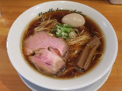 ジョニーヌードル | ラーメン | 東京都千代田区平河町 | ★★ (2012.7.25) | 普通 | ![]() | 半蔵門駅の南側の路地にあります。ラーメン屋とは思わないような外観です。店内も白い壁、木の床などカフェか何かのような雰囲気です。テーブルが4つ、カウンターが8席あります。東京醤油老麺(650円)+チャーシューご飯(中)(250円)を食べました。、のり、めんま(多い)、チャーシュー、刻みネギ、ナルトが入っていました。麺は普通の太さで縮れています。スープはとても美味しいです。鶏、豚、野菜のスープと鰹、昆布、煮干のスープを混ぜているそうです。何故か盛岡冷麺などもあります。店員さんの活気があります。夜は飲めるラーメン屋になるようです。 |