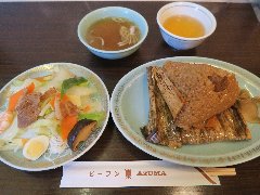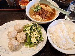 ![]() | 八丁堀駅から7、8分、隅田川の近くの路地にあります。マンションの1階です。13時過ぎでしたが並んでいました。店内は、カウンター席が6つ、テーブルが3つありました。テーブルにザーサイが置かれていました。シューマイ定食(950円)を注文しました。ライスと半ラーメンが付きます。シューマイは白っぽくて柔らく旨味が詰まってました。半ラーメンは細めの麺、ひき肉、青菜、メンマが乗っていました。少し酸味のあるスープでした。ボリュームありました。美味しかったです。特にラーメン美味しかったです。他には、ラーメン、担々麺、パーコーメンなどがありました。 |