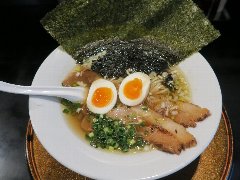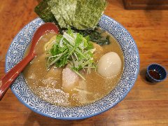 ![]() | 九段下駅から2分ほど、目白通りの飯田橋一丁目交差点の近くの路地にあります。ビルの1階です。やたがらすと読みます。数人の行列が出来ていました。店内は、カウンター席が9つありました。ハードな曲が音量高めで流れていました。TOKUSENRAMEN黒(1150円)を注文しました。三つ葉、味玉、チャーシュー、ワンタン、刻みネギが入っていました。チャーシューは薄めのレアタイプです。麺は細めのストレート、スープは、魚介や野菜の出汁に生醤油、表面に鶏油が浮いていました。きれいな色をしています。動物系が入っていませんが味わい深く優しい味です。美味しかったです。でもちょっと高いかな。他には、ラーメン白、2019金、お茶漬けセットなどがありました。 |