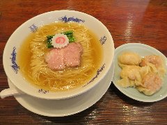 ![]() | 本郷三丁目駅から1、2分、本郷三の交差点の南東方面の路地にあります。黒壁に広い暖簾が目印です。昼時からはだいぶ過ぎていましたが、行列が出来ていました。店内は、カウンター席が10ありました。明るくてきれいです。中華そば肉2個海老2個(1040円)を注文しました。ナルト、チャーシュー、ほうれん草、ワンタン(肉2、海老2)は別皿で出されます。麺は中細のストレートです。スープは魚介系+動物系の出汁、魚介の方が強く感じます。きれいな色で旨味があって優しい味です。ワンタンはどちらも大きめで具がぎっしり入っていました。美味しかったです。他には、山椒そば、皿ワンタン、マヨチャーシューご飯などがありました。 |