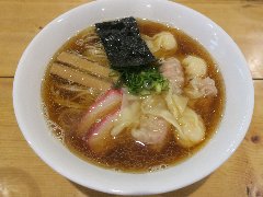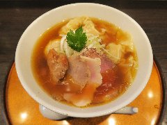 ![]() | 稲荷町駅から1分、浅草通り沿いにあります。レンガ壁のマンションの1階にあります。白い暖簾が出ています。店内は、カウンター席が7つ、テーブルが4つありました。ちょっと薄暗いです。基本メニューは、白醤油の白と黒醤油の黒があります。黒特製ワンタンメン(1020円)を注文しました。海苔、メンマ、チャーシュー、肉ワンタン3個、エビワンタン3個、刻みネギが入っていました。麺は細めのストレートです。スープは、魚介と動物の出汁に黒醤油、煮干し系の魚介の方が強いです。きれいな色で表面には多めの油が浮いていました。ワンタンはプリプリで食べ応えあります。美味しかったです。他には、つけめん、ワンタン皿盛りなどがありました。 |