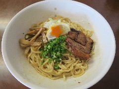 焼麺 劔 | ラーメン | 東京都新宿区高田馬場 | ★ (2016.11.19) | 普通 | ![]() | 高田馬場駅早稲田口から4、5分、神田川に近い住宅街にあります。ビルの1階です。店内は、ステンレスのカウンター席が10、薄暗いです。厨房は隙間から見える程度で板で仕切られています。麺を焼くときに跳ねるからでしょうか。理由は分かりません。目玉焼麺(840円)を注文しました。魚粉と鰹節が入ったすり鉢が出されます。チャーシュー、メンマ、玉子、青ネギが入っていました。見た目は焼きうどん風です。麺は太麺で、茹でてから焼かれています。パリパリで香ばしくモチっとしています。スープは、豚骨ベジポタ系で美味しいです。かなり独特です。後から魚粉と鰹節を投入すると味が変わって面白いです。他には、揚げネギ焼麺、チャーシュー焼麺、ラーメンなどがありました。大盛りは無料です。 |