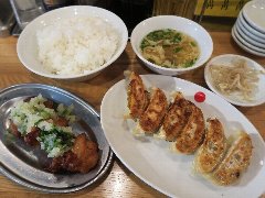 ![]() | 神田駅西口から2分ほど、神田駅西口商店街にあります。ビルの1階です。店内は、カウンター席が7つ、テーブルが多数ありました。白壁で明るくてきれいです。ぎょうざ唐揚げ定食(750円)を注文しました。にんにく有無を選べますがもちろん有りです。ライス、スープ、もやしの和え物が付きます。餃子は小ぶりで薄皮です。きれいな焼き色でパリっとした皮に野菜の餡がジューシーでした。唐揚げは塩ネギが乗っていました。美味しかったです。そして安いです。他には、ぎょうざ定食、しそぎょうざ定食、胡麻坦々水餃子定食などがありました。居酒屋としても使えそうです。 |