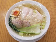 ![]() | 新宿御苑前駅から4分ほど、旧甲州街道の新宿一丁目の交差点を北に進むとあります。ビルの1階です。ガラス戸のカフェのような外観です。店内は、カウンター席が7つ、テーブルが1つありました。明るくてきれいです。テーブルにニンニクチップが置かれていました。得製潮そば(1100円)を注文しました。わかめ、チャーシュー(2種類)、味玉、穂先メンマ、ワンタン、刻みネギ、刻み柚子が入っていました。麺は細めのストレートです。スープは鶏とあさりなどの出汁に3種類の塩を使用、すっきりとして出汁の旨味が伝わります。美味しかったです。2種類のチャーシューが美味しいです。他には、醤油そば、鶏白湯そば、つけそばなどがありました。 |