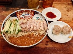 ![]() | 新富町駅から4、5分、新大橋通り沿いにあります。マンションの1階です。ガラス戸の外観です。店内は、向かい合ったカウンター席が多数ありました。きれいですがやや薄暗いです。だあろうりゃんめん(1000円)と焼売2個(200円)を注文しました。細麺の上に、豚バラチャーシュー、きゅうり、肉みそが乗っていました。豚バラには棒棒鶏のタレが掛かっていました。少し酸味があってさっぱりしてます。焼売は肉がたっぷり入っていました。美味しかったです。他には、だんだんめん、ちいすいだんだんめん、しなめんなどがありました。 |
