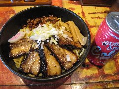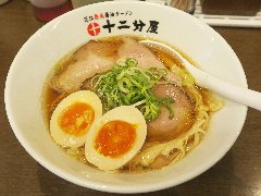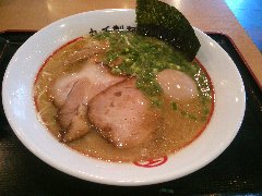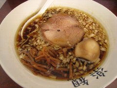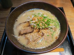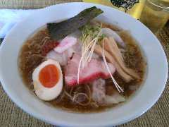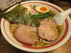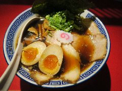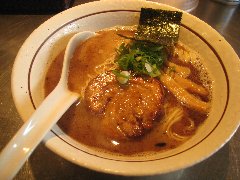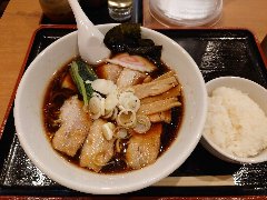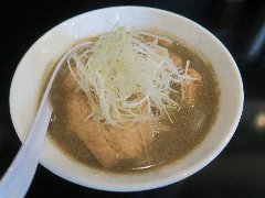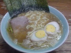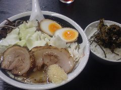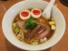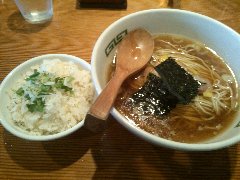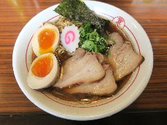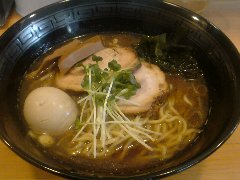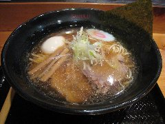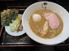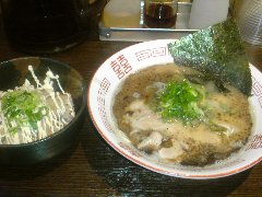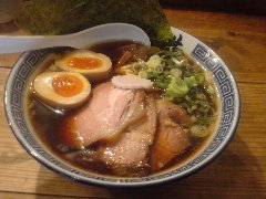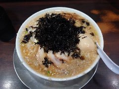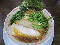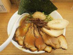 こうかいぼう | ラーメン | 東京都江東区深川 | ★★ (2012.11.16) | 普通 | ![]() | 門前仲町駅から7、8分のほど、葛西橋通り沿いにあります。平日の12時前だというのに店の外に9人、中に4人の行列が出来てるほどの人気店です。カウンター席が7つ、テーブル席が2つありました。ご夫婦なのか店員は2人、とても丁寧な接客です。ちゃーしゅーごはんセット(850円)+味玉(100円)を食べました。海苔、チャーシュー(美味しい)、メンマ、味玉、刻みネギが入っていました。麺は丸富製麺特製のたまご麺を使用し、太さは普通で少し縮れています。スープは豚のげんこつ、鶏ガラ、昆布、煮干、野菜、鰹節、塩は大島自然海塩、水はシーガル浄水器を使用しているそうです。濁った茶色いスープです。美味しいですが、かなりあっさりしています。因みに器は美濃焼だそうです。ちゃーしゅーごはんは、ほぐしたチャーシューとちぎった海苔が乗っています。店を出るときには行列が延びていました。 |
