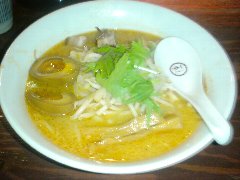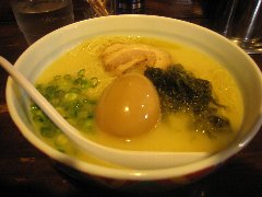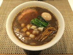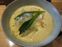 一途 | ラーメン | 東京都品川区小山 | ★★ (2014.3.16) | 普通 | ![]() | 武蔵小山駅、賑やかなアーケード方面ではない東の方へ5分ほど歩くとあります。マンションの1階にありますが和食屋のような外観です。店内は黒い壁、木がふんだんに使われお洒落で落ち着いた雰囲気です。カウンター席が11、テーブルの個室もあるようです。麺 利(とし)(800円)を食べました。小松菜、刻みネギ、とりチャーシューが入っていました。麺は細めです。スープは、カレーに生クリームを加えたもので、泡立っていてとてもクリーミーなカレー味です。子牛の骨、丸鶏から作るフォン・ド・ヴォーと香味野菜、昆布などから作るそうです。美味しいスープです。飲み干せます。しかし、もはやラーメンのスープではないです。半ライスが無料です。他のラーメンは、卓(たく)(醤油)、途(みち)(カレー)などがあります。 |