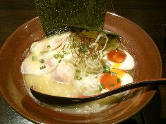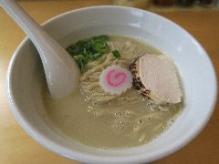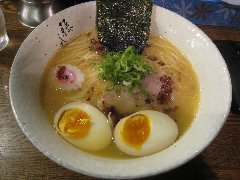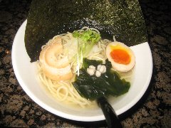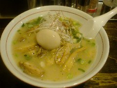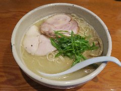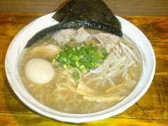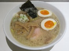 麺屋 社中 | ラーメン | 東京都墨田区業平 | ★★ (2012.11.13) | 普通 | ![]() | 押上駅、話題の東京スカイツリーのすぐ近く、浅草通り沿いにあります。お店の入口は開けっ放し、脇に浅草開化楼の麺を入れる木箱が積んであります。店内は割りと広いです。カウンター席が8つ、テーブルが3つあります。ラーメンの麺の硬さ、スープの濃さが選べます。あっさり鶏そば味玉入り(780円)を食べました。白髪ネギ、味玉、サフラン、刻みネギ、メンマ、鶏のチャーシュー、鶏団子(軟骨入り)、ゴマが入っていました。麺は細麺で縮れています。スープは鶏100%で白濁しています。こってりに見えますが意外とあっさりしています。美味しいです。夕飯時でしたが空いていました。 |