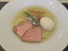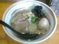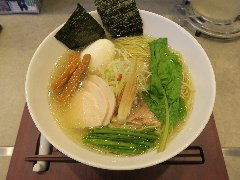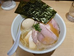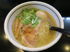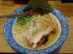 ![]() | 大井町駅中央口から2分ほど、大井三ツ又商店街沿いにあります。マンションの1階です。ガラス戸の外観です。店内は、カウンター席が10ありました。きれいです。味玉塩らぁめん(800円)を注文しました。炙ったチャーシュー、メンマ、味玉、水菜が入っていました。見た目がシンプルです。麺は細めのストレートです。スープは鶏と節系の出汁、透き通ってきれいです。バランスがよく旨味たっぷりで、すっきりした優しい味わいでした。美味しかったです。他には、醤油らぁめん、替え玉、ちゃーしゅーご飯などがありました。 |