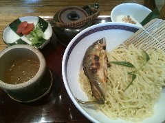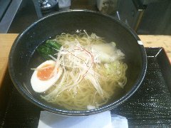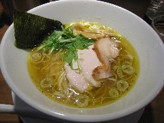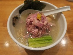 鮎ラーメン | ラーメン | 東京都世田谷区玉川 | ★★★ (2013.8.3) | 普通 | ![]() | 二子玉川駅から5分ほど、高島屋の裏の方にあります。開けっ放しの店で、カウンター席が6つあります。天井からはアルコールランプがぶら下がっていました。ラーメンのメニューは鮎ラーメン、鮎涼ラーメンなどがありますが昼は鮎涼だけのようでした(夏限定?)。鮎涼ラーメン(1000円)+大盛(100円)を食べました。麺の上には鮎の一夜干し焼きが乗っています。内臓は取り除いてあります。つけ汁は冷たくされた鮎の煮こごりです。麺は普通の太さで縮れています。 涼しげで見た目もよし、麺も鮎もとても美味しいです。その他に、鮎のフレークが掛かったご飯と鮎で出汁をとったスープが付きます。ご飯にスープを掛けて茶漬けにします。こちらも美味しいです。赤カブの漬物も付きます。店員さんはとても丁寧です。理想ですけど、一夜干しではなくて内臓も食べたいので塩焼きがいいですね。そりゃ無理か・・・ |