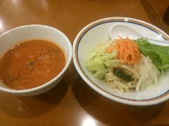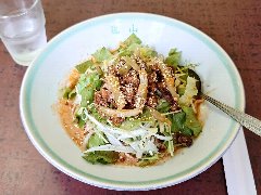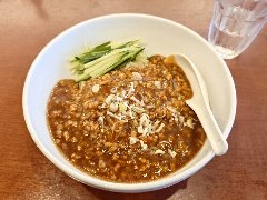 ![]() | 東大島駅大島口から7分ほど、駅の南西方向の住宅街にあります。2階建ての建物です。けっこう派手めの外観です。店内は、テーブルが7つありました。壁に短冊メニューがいっぱい、フロア担当はおばあちゃんです。冷し担々麺(1100円)を注文しました。肉味噌、ザーサイ、レタス、長ネギ、水菜、白ごまなどが乗っていました。麺は中細の縮れ、タレはゴマが香るピリ辛で酸味がありました。肉味噌がいいアクセントになって食欲をそそります。暑い日にいいですね。美味しかったです。他には、ワンタンメン、うま煮麺、五目から焼きそばなどがありました。 |