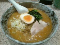 らーめん | ラーメン | 東京都大田区大森北 | ★ (2012.3.5) | 普通 | ![]() | 大森駅東口から3分ほどのところにあります。店内は薄暗くジャズが流れ、ちょっとしゃれたバーのような雰囲気です。カウンター席が12席、2階にテーブル席もあるようです。味噌らーめんが一押しのお店のようです。海老茶色の味玉みそ(880円)を食べました。水菜、もやし、玉ねぎ、ネギ、太いめんま、角切りチャーシュー、挽き肉が入っていました。麺は普通の太さで縮れています。甘みのあるスープはコクがあって美味しいです。もっと野菜が入っているといいですね。 |