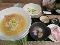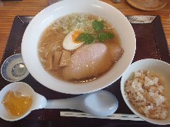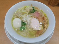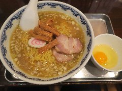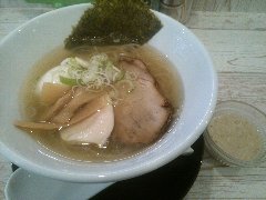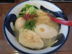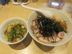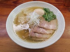 中華そば 大井町 和渦 | ラーメン | 東京都品川区大井 | ★★★ (2017.7.2) | 普通 | ![]() | JR大井町駅中央口から5、6分、大井三ツ又中通り交差点に近くの路地にあります。青いテント、店名が書かれた垂れ幕の前に花が生けてありました。店内は、カウンター席が6つ、かなり狭いです。白壁で明るいです。特製塩そば(1000円)と限定ランチサービス鶏おろしポン酢丼(10円)を注文しました。ワンタン、チャーシュー(鶏と豚)、穂先メンマ、味玉、三つ葉、ゆず、刻みネギが入っていました。麺は細めのストレートで量は多め、スープは水と鶏だけで作るそうで、この日は名古屋コーチンのガラ、天草大王の丸鶏と書かれていました。旨み濃厚な鶏出汁で油は多めですが優しい味でとても美味しいです。驚きの10円丼は、ポン酢がさっぱりとして美味しいです。他には、醤油そば、炙りチャーシュー丼などがありました。 |