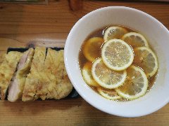 りんすず食堂 | ラーメン | 東京都江東区大島 | ★ (2016.6.11) | 普通 | ![]() | 大島駅から西に向かって3分、新大橋通り沿いにあります。煉瓦壁のビルの1階にあります。店内は、カウンター席が10、テーブルが1つありました。カウンターには立派な厚い木材が使われていました。壁には、テレビ番組のロケの写真がいっぱい飾ってありました。レモンラーメン+鶏天(1000円)を注文しました。ラーメンの具はレモンのみです。麺は、普通の太さでストレートです。スープは、蕎麦汁と動物系を合わせていてかなり和風です。当然、レモンは酸っぱいです。さっぱりとして美味しいですが、レモンの扱いに困りました。鶏天は揚げたてで熱々です。ラーメンに入れればパーコーメン風です。他には、氷レモンラーメン、鶏天ラーメン、カレーつけ麺などがありました。 |