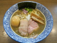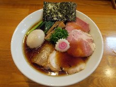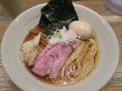 ![]() | 二子玉川駅から4、5分、中吉通り沿いにあります。ビルの1階、間口が狭いです。行列がありました。店内は、カウンター席が7つありました。明るくてきれいですが狭いです。特製中華そば醤油(1150円)を注文しました。海苔、チャーシュー(2種類)、めんま、味玉、三つ葉、刻み玉ネギが入っていました。麺は中太の平打ちストレートです。スープはアサリや帆立などの貝出汁と国産豚の生背ガラの豚煮込み出汁です。どちらの出汁も旨味がたっぷりでバランスがいいです。美味しかったです。他には。中華そば塩、くらむそば醤油、くらむそば塩などがありました。 |