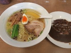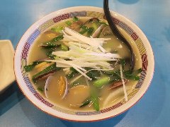 ![]() | 市場前駅から4、5分、豊洲市場の管理施設棟の3階にある飲食エリアにあります。赤い暖簾が出ていました。店内は、コの字のカウンター席が10、テーブルが1つありました。壁にたくさんのメニューが貼ってありました。あさりラーメン(1150円)とジャンボ焼売2個(360円)を注文しました。あさり、ニラ、きくらげ、タケノコ、生姜、玉ねぎ、長ネギなどが入っていました。麺は細めでやや縮れていました。スープはあさり、動物系、野菜などの旨味、やさしい味わいでした。あさりはけっこう入っていました。焼売は何も付けなくても味付けされています。酢も合います。どちらも美味しかったです。他には、中華そば、ニラそば、肉野菜炒めなど定食もありました。冬は牡蠣ラーメンもあるようです。 |
