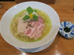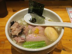 ![]() | 下北沢駅東口から3分ほど、下北沢一番街商店街にあります。ビルの1階です。店内は、カウンター席が9つありました。狭いです。元々居酒屋のような雰囲気です。特製塩らーめん(1000円)を注文しました。三つ葉、メンマ、海老ワンタン、味玉、白髪ネギが入っていました。手打ちの麺はうどんのような極太、表面はモチっとしてますが柔らかくてコシはあまりありません。スープは、鶏の手羽先、浅利、鰯、鰹、羅臼昆布などで出汁ととるそうです。塩ダレには鮎魚醤も入っているそうです。やや濁って旨味が濃いです。魚介が強めでややしょっぱかったです。美味しかったです。麺がかなり変わってました。他には、スープ茶漬けセット、炙り肉飯などがありました。 |
