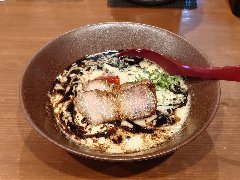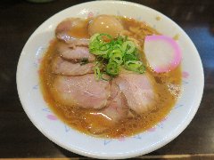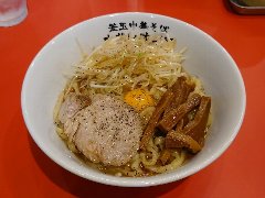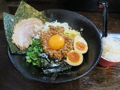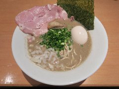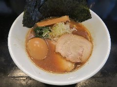 ![]() | 大岡山駅から南に2分ほど、住宅街に入った辺りにあります。マンションの1階です。店内は、カウンター席が8つありました。特製らーめん(930円)を注文しました。海苔3枚、味玉、メンマ、ほうれん草、チャーシュー(バラと肩ロース)、刻みネギが入っていました。麺は、太めでやや縮れていました。スープは、豚骨醤油の家系です。色が茶色っぽくミソラーメンのように見えます。しっかり豚骨ですがしつこくなく、家系独特のしょっぱさがなくマイルドな感じがいいです。チャーシューと味玉は薫製されていました。美味しかったです。小ライスは無料です。他には、旨辛らーめん、まぜそば、ニラトン丼などがありました。 |