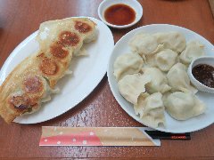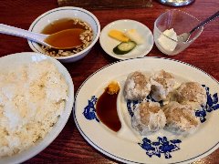 ![]() | 京急蒲田駅から2分ほど、商店街あすとのアーケード内にあります。ビルの1、2階、派手な中華風看板が目立っています。店内は、1階はテーブルが多数、2階も広く円卓もあるようです。白い壁には直にサインが書かれていました。炒飯(605円)、餃子(330円)、水餃子(550円)を注文しました。炒飯はスープが付きます。具はハム、玉子、ネギであっさり味でした。餃子は6個、羽付きで丸っこい形、羽は香ばしく皮は厚めでした。水餃子は10個、皮がもっちりしていました。特製のタレが付きます。どちらも美味しかったです。餃子はそれほど大きくはないですが皮が厚めなのでけっこうボリュームがあります。そして安いです。土日はセットが無いので単品で注文しましたが、さすがに水餃子10個は食べきれなくてお持ち帰りました・・・。他には、フカヒレ餃子、ナマコ餃子、蒸し餃子、各種中華料理がありました。 |