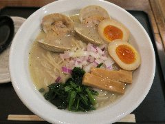![]() | 学芸大学駅東口から2分、小さな飲食店がひしめく学大十字街にあります。見た目は居酒屋、黄色い暖簾が目印です。店内は、カウンター席が4つ、テーブルが5つありました。壁は板張り、椅子はパイプ椅子です。夜は居酒屋、昼間の間だけ間借りのラーメン屋なのだそうです。ですので店内は何となく油っぽく居酒屋の臭いが染みついていました。はまぐり白湯ラーメン(1000円)を注文しました。ハマグリ、メンマ、ほうれん草、味玉、刻み玉ネギが入っていました。麺は中太のストレートです。スープは、大山鶏や総州古白鶏、美桜鶏で作った鶏白湯に白ハマグリの出汁、濃すぎるぐらいに濃厚で旨味たっぷりです。美味しかったです。他には、フュージョン(海老出汁)の2種のみです。ご主人が元気でした。 |