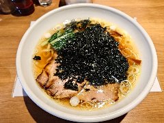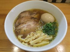 ![]() | 経堂駅南口から1、2分ほど、農大通り商店街沿いにあります。マンションの1階です。ガラス張りの外観です。店内は、カウンター席が13、テーブルが3つありました。明るくてきれいです。味玉らぁめん(880円)を注文しました。味玉、チャーシュー、太いメンマ、九条ねぎ、大きめの刻みネギが入っていました。卵はマキシマムこいたまごというブランドだそうです。麺は全粒粉が入った中細のストレートです。スープは清湯醤油、大山どりの丸鶏でとった出汁だそうです。鶏の旨味がよく出ています。油は多めで少し甘めでした。美味しかったです。他には、塩らぁめん、煮干そば、つけ麺、まぜそばなどがありました。店員さんは丁寧でした。 |