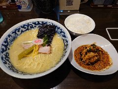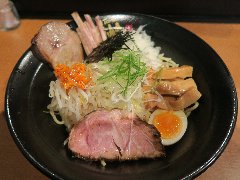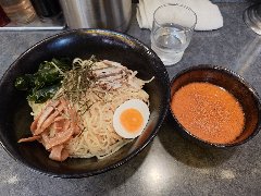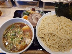 ![]() | 大森駅東口から4、5分、ミルパ商店街の入口付近にあります。ビルの1階です。大きな垂れ幕が掛かっていました。店内は、カウンター席が10ありました。まだ新しくきれいです。特製醤油つけ麺(1250円)を注文しました。麺の上に、刻み海苔、ナルト、ほうれん草、メンマ、味玉、チャーシューが乗っていました。つけ汁に刻みとうがらし、ネギ、チャーシューが入っていました。具だくさんです。麺は太めの平打ちで縮れていました。スープは、動物系の出汁に醤油と生姜が利いています。甘味と唐辛子の辛味もありバランスがいいです。チャーシューは柔らかいです。スープ割は暖め直してくれます。美味しかったです。他には、醤油ラーメン、塩ラーメン、塩つけそば、まぜそばなどがありました。 |