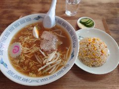 ![]() | 鵜の木駅から1分、多摩堤通りの鵜の木駅前交番前交差点にあります。2階建ての1階です。赤い暖簾が掛かっていました。レトロな外観です。店内は、カウンター席が2つ、テーブルが2つありました。小ぢんまりしています。かなりレトロです。ラーメン+ミニチャーハン(700円)を注文しました。チャーシュー、ゆで卵(半)、ナルト、もやし、刻みネギが入っていました。麺は中細で縮れていました。スープは、鶏もみじ、魚介、昆布などの出汁、シンプルで懐かしい味わいでした。チャーハンはチャーシュー、かまぼこ、玉子、ネギなどが入っていました。パラパラタイプでいいです。漬物が付きます。美味しかったです。他には、タンメン、横手やきそば、中華丼、焼肉定食などがありました。 |