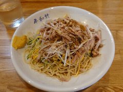東京いまむら | ラーメン | 東京都品川区南品川 | ★★ (2013.9.14) | 普通 | ![]() | 新馬場駅の南口から車道出でるとすぐあります。店は開けっ放しです。店内は非常に狭くカウンター席が7つだけです。何故かそのカウンターにはゴザが貼られています。カウンター内の向こうの厨房には強面の店主がいます。店主が聞くまで注文はしないよう注意書きがあります。煮干増し表(煮干処方箋)なる張り紙があって、煮干(極上イワシ干し、超極上アゴダシ)の量を指定できるようです。冷やし雲呑そば(950円)を食べました。海苔、めんま(甘い)、かいわれ、中華ハム、玉子(半)、なると、刻みネギ、豆板醤、ワンタンが入っていました。麺は細麺のストレートです。量は多めです。スープは冷たい鶏と魚介です。美味しいです。容姿からは想像できない繊細なラーメンでした。他には、地鶏そば、東京そば、雲呑そば、叉焼そば、鶏香麺(和えそば)などがありました。 |