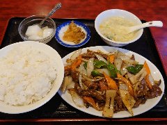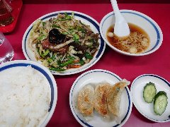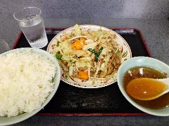![]() | 糀谷駅から7、8分、おいで通り商店街をまっすぐ進んだ辺りにあります。2階建ての建物です。ターコイズグリーンの壁、赤い暖簾が掛かっていました。店内は、カウンター席が6つ、テーブルが2つありました。かなりレトロな雰囲気、壁には手書きの短冊メニューがいっぱいでした。肉野菜炒め(900円)とライス(350円)を注文しました。スープが付きます。ライス普通はけっこう大盛です。肉野菜炒めは豚肉、キャベツ、もやし、人参、ピーマン、玉ねぎなどが入っていました。野菜はシャキシャキで味付けは程よいです。けっこうボリュームありました。美味しかったです。雰囲気の割りにちょっと高いかな。他には、ざるラーメン、ニラソバ、ギョウザ、チャーシューエッグなどがありました。 |