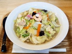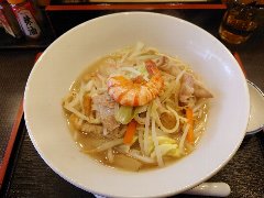 ![]() | 青物横丁駅から3分ほど、ジュネーヴ平和通り沿い、八潮高校入口の交差点の近くにあります。けっこう派手な看板です。店内は、コの字カウンターが12ありました。カウンターの上に惣菜が入った大皿が置かれていました。チャンポン(750円)を注文しました。エビ、豚肉、いか、かまぼこ、キャベツ、人参、もやし、ちくわなどが入っていました。麺は太めのストレートです。スープは豚骨や魚介などの出汁で白濁していました。あっさりですがいろいろな旨味がたっぷりでした。美味しかったです。ちょっとスープが少ないかな。他には、皿うどん、まぐろ漬け丼、鯖の塩焼き、煮込みはハンバーグなど長崎に関係ないものもいろいろありました。 |