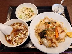 ![]() | 新馬場駅から3、4分、北馬場参道どうり沿いにあります。マンションの1階です。外にメニューの写真がいっぱい貼られていました。店内は、テーブルが多数、小上がりのテーブルもありました。割りときれいです。ランチの五目焼きそば(950円)を注文しました。サラダ、ワンタンスープ、デザートが付きます。焼きそばは、豚肉、イカ、キクラゲ、人参、白菜などが入ってた中華餡が掛かっていました。麺は少し焦げ目があって香ばしいです。ワンタンはつるつる、いい味わいです。美味しかったです。他のランチは、ラーメン半チャーハン、冷し中華半チャーハン、レバニラ炒めなどがりました。 |