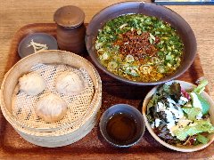 ![]() | 雪が谷大塚駅南口から2分ほど、雪谷商店街にあります。3階建ての1階です。入口は路地にありちょっと地味な感じです。店内は、カウンター席が6つ、テーブルが8つありました。明るくてきれいです。カフェっぽいですが中華料理居酒屋なのだそうです。ランチの台湾ラーメンセット(1300円)を注文しました。サラダと小籠包が付きます。ラーメンは台湾ミンチ、もやし、ニラ、ネギが入っていました。麺は中細の縮れ、スープは鶏出汁、甘辛で少しピリっとします。台湾ミンチがいい味出してます。小籠包はプリプリでした。美味しかったです。他には、カニチャーハン、プリプリ海老のフォーのセットなどがありました。 |