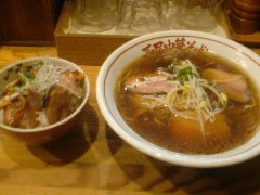 一汁三にぼし | ラーメン | 東京都渋谷区幡ケ谷 | ★★ (2009.9.17) | 普通 | 無し | 幡ヶ谷駅の北側にある商店街からちょっと路地に入ったところにあります。分かりにくいです(迷いました)。不如帰(ほととぎす)という店を目指していたのですが、暖簾には裏不如帰と書いてあります。疑問に思い並んでいた方に「不如帰って別の場所ですか?」聞いたところ、なんと普段は不如帰だが木曜日だけは裏不如帰と店の名前が変わるらしいです。で、何が違うかと言うと普段はハマグリ、裏は煮干で取ったスープなのだそうです。なので今日は煮干のスープです。店内は狭くカウンターは8席しかありません。煮干しそば味玉入り+肉めし(850円+200円)を食べました。めんま、のり、ねぎ、じゃこ、チャーシュー、味玉が入っていました。麺は少しだけ縮れています。スープは前述のように煮干がメインで動物系(豚)と合わせ、魚粉が入っています。若干しょっぱい気もしましたが味は美味しいです。豚めしにはタレをかけたご飯の上にチャーシュー、ネギ、海苔が入っています。ゴマ油の香りがいいですね。表の日にも来たいですね。 |