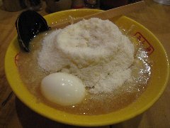 九十九とんこつラーメン | ラーメン | 東京都渋谷区広尾 | ★★★ (2013.11.3) | 普通 | ![]() | 恵比寿駅から南青山方面に向かう坂の途中にあります。店内は割りと広くカウンター席とテーブル席があります。扉の外にも1つテーブルがあります。ランチトッピングサービスで、海苔、ゆで卵、コーン、半ライス、サラダ、ピリ辛もやし、ネギ、激辛高菜の中から2品選べます。元祖〇究チーズラーメン(900円)を食べました。玉子、コーンを選びました。大量の粉チーズ、もやし、玉子、コーンが入っていました。粉チーズは北海道産のコーダチーズだそうで、最初は冷たいですが徐々にスープに溶けていきます。麺は普通の太さです。スープは味噌トンコツです。チーズが合わさると濃厚な味わいになりとても美味しいです。ふれこみ通りクセになる味です。元祖〇究チーズラーメンは商標登録されているようです。 |