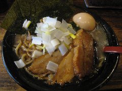 麺屋ごとう | ラーメン | 東京都豊島区西池袋 | ★ (2010.4.8) | 普通 | 無し | 池袋駅の西口から5分ほど、立教大学の近くのビルの半地下にあります。営業は4時30分(またはスープ切れ)までで閉店10分前くらいに行ったので最後の客でした。カウンターのみで13席です。煮玉子ラーメン(小)(730円)と食べました。小は200g、中は300gで同額です。大は400gで100円アップです。チャーシュー(大きい)、のり、めんま、煮玉子が1.5個入っていました。煮玉子はゆで卵のような感じでした。麺は太麺のストレートです。スープは動物魚介でちょっと酸味があります。美味しいです。後から気付いたのですがこの店は大勝軒の系列のようで有名なあの方との写真が飾られていました。なのでつけ麺の店だったようです。表の暖簾にも特製もりそばって書いてありました・・・ |