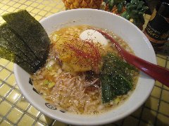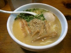 創新麺庵 | ラーメン | 東京都豊島区池袋 | ★ (2012.7.20) | 小高 | ![]() | 池袋駅西口、丸井の北側の辺りにあります。ぱっと見は居酒屋のような建物です。店内はカウンターのみの10席です。上生粋塩(1000円)を食べました。チャーシュー2枚、ピンク色の煮玉子、軟骨つくね、三つ葉、刻みネギが乗っていました。ピンク色の煮玉子は海老の味がしました。麺は普通の太さで縮れています。魚介系が強いスープです。美味しいです。トッピングの具も美味しいです。魚介の正体は秋刀魚だそうです。素材にはかなりこだわっているようです。でも1000円は高いなあ。つけ麺などもあります。 |