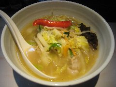 だいはち | ラーメン | 東京都豊島区東池袋 | ★ (2014.3.21) | 普通 | ![]() | 有楽町線の東池袋駅、都電の東池袋四丁目駅の近くにあります。店内はカウンター席が10、席の後ろは狭くて通れません。タンメンがメインのお店です。スープは塩、味噌、醤油から選びます。タンメン(並)(塩)(730円)を食べました。丼とれんげがデカイです。キャベツ、モヤシ、キクラゲ、ニラ、白菜、パプリカ、ヤングコーン、挽き肉、豚肉が入っていました。野菜が多めです。麺は普通の太さでストレートです。スープは鶏ガラ、昆布、野菜などの出汁の旨味ですが、ちょっとしょっぱい感じがしました他には、スタミナラーメン、味噌つけ麺などがありました。 |