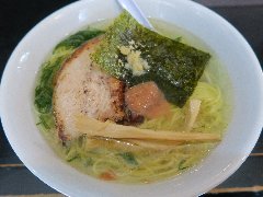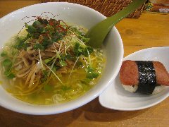 Hulu-lu | ラーメン | 東京都豊島区池袋 | ★★★ (2014.9.6) | 普通 | ![]() | 池袋駅西口から5分ほど、池袋二丁目の交差点に近くにあります。外観は全くラーメン屋には見えません。店内はゆったりしたカウンター席が5つ、テーブルが2ありました。明るくてきれい、お洒落なハワイアンカフェといった雰囲気です。そのせいかカップル率が妙に高いです。カウンターにスパムむすびが積まれていました。塩SOBAスパムセット(960円)を注文しました。ゆず、糸トウガラシ、メンマ、鶏の挽き肉、チャーシュー、刻みネギ、かいわれが入っていました。麺は、平打ちか細麺を選べますが、細麺にしました。スープはきれいな鶏清湯です。ゆずと挽き肉が入ってさらに美味しくなっています。スパムむすびにはこんぶの佃煮が挟まれていました。店を出ると行列が出来ていました。人気店です。 |
