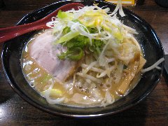京都進化系 | ラーメン | 東京都豊島区東池袋 | ★ (2016.1.3) | 普通 | ![]() | 池袋駅東口(中央)から4、5分、賑やかな繁華街にあります。ラーメン激戦区です。緑色のテントに大きく京九条ねぎらーめんと書かれています。店内は、カウンター席が11、大テーブルが1つありました。少し薄暗いです。京九条ねぎらーめん(880円)を注文しました。たっぷりの九条ネギ、チャーシュー(肩ロース)が入っていました。麺は、細くてやや縮れていました。スープは、鶏ガラ、香味野菜、チャーシューの煮汁、複数の節で出汁をとるそうです。背脂がたくさん入っていますが、それほどしつこくありません。割と甘めです。しゃきしゃきの九条ネギと絡んで美味しいです。他には、鶏ガラとんこつ醤油、特製味噌らーめん、赤辛らーめんなどがありました。以前は、鶏ガラとんこつラーメンが売りだったようです。 |