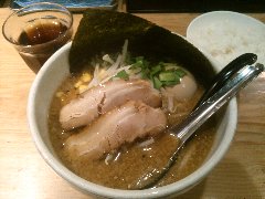 麺恋処 いそじ | ラーメン | 東京都渋谷区代々木 | ★ (2009.12.16) | 普通 | 無し | 代々木駅から南西の方に坂を下っていくとあります。山崎製麺所の隣です。11時半の開店時間前に行ったため誰も居なかったのですが、開店時には7人ほどの列ができました。外観とは違って店内はきれいです。カウンターのみで9席です。小さな店ですが店員さんが4人いました。得つけめん中盛(940円)を食べました。中盛り無料です。まず、ゆずを入れて良いか確認されます。もちろんOKです。味玉、海苔、チャーシュー3枚、なると、細く切ったメンマが入っていました。麺はうどんのように太いです。スープは「仔牛の骨を加えてコクを引き出した魚介&動物スープ」だそうで、刻みねぎ、ゆず、魚粉が入っていました。油は少な目で魚介の味が強いです。美味しかったです。スープ割りしましたがちょっとしょっぱかったです。 |