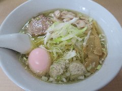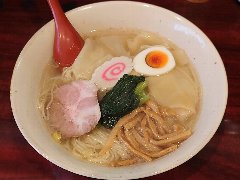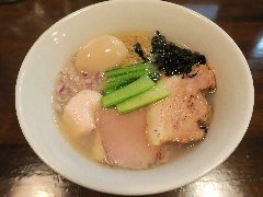光ら〜めん | ラーメン | 東京都北区東十条 | ★★ (2016.7.23) | 普通 | ![]() | 東十条駅から2分ほど、マンションの1階にあります。店内は、カウンター席が6つ、せまいです。あまり飾りっけのない装飾です。特製塩ラーメン(950)を注文しました。味玉、メンマ、チャーシュー(豚と鶏)、つくね団子、刻みネギ、柚子が入っていました。味玉は桜えびエキスで煮込んでいるそうでピンク色です。つくね団子は鶏肉と軟骨が入っています。麺は、細めで縮れています。スープは、鶏出汁と魚介でしょうか。澄んだ色で優しい味です。塩は、フランスのゲランドの塩とモンゴル産の湖塩を使用しているそうです。美味しいラーメンです。他には、昆布らーめん(塩)、ネギソースらーめん、醤油らーめん、水餃子などがありました。ご主人は気さくな方でした。 |